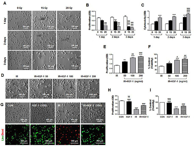 Figure 1: Morphological changes, cell proliferation and viability of hPECs after irradiation. (A) Irradiation induced morphological changes of hPEC in a time- and dose-dependent manner. Scale bars represent 100 μm. (B) Proliferation of hPEC after irradiation was examined. (C) Cytotoxicity of hPEC after irradiation was examined. Data are presented as the means ± SEM (n = 5). Two-way ANOVA, Bonferroni›s post hoc test. *, compared to 0Gy in each group; #, compared to 15 Gy in each group, $, compared to 15 and 20 Gy in 2 days. ***P <0.001, ###P < 0.001, $$$P < 0.001. (D) Effect of dose dependent-KGF-1 on irradiation-induced changes in cell proliferation and viability in hPEC. Scale bars represent 100 μm. (E) Proliferation of hPEC after IR+KGF-1 was examined. (F) Cytotoxicity of hPEC after IR+KGF-1 was examined (n = 5). One-way ANOVA, Tukey’s post hoc test. *, compared to IR; #, compared to IR+KGF-1 (50 ng/ml). *P < 0.05, **P < 0.01, ***P < 0.001, #P < 0.05, ##P < 0.01, ###P < 0.001. (G) Effect of KGF-1 on irradiation-induced changes in cell proliferation and viability in hPEC. Scale bars represent 100 and 200 μm. (H) Proliferation of hPEC after IR+KGF-1 was examined. (I) Cytotoxicity of hPEC after IR+KGF-1 was examined (n = 5). One-way ANOVA, Tukey’s pot hoc test. *, compared to CON; #, compared to IR; $, compared to IR+KGF-1. ***P < 0.001, ###P < 0.001, $$P < 0.01, $$$P < 0.001.