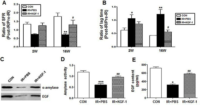 Figure 5: Effect of salivary function by KGF-1 treatment. (A) Salivary flow rate (SFR) was calculated at pre-irradiation and 2 and 16 weeks post-irradiation. The changes in SFR after irradiation were expressed by the ratio of post-irradiation SFR to pre-irradiation SFR (Mean ± SEM). (B) Time to salivation (lag time, LT) was measured and the ratios of post-irradiation LT to pre-irradiation LT were presented. Data are presented as the mean ± SEM. (A, B and E) Two-way ANOVA, Bonferroni’s post hoc test. *, compared to CON in each group; #, compared to IR+PBS in each group. . *P < 0.05, **P < 0.01, #P < 0.05. (C) Western blotting of amylase and EGF in saliva at 16 weeks post-irradiation. (D) The salivary amylase activity was examined by the Assay Kit and fold changes in activity level are presented. (E) EGF contents were measured at each time point and the average contents are presented. Data are presented as the mean ± SEM. One-way ANOVA, Tukey’s post hoc test. *, compared to CON; #, compared to IR. *P < 0.05, ***P < 0.001, ##P < 0.01. 2 weeks (n = 3 in all groups), 16 weeks CON group (n = 3), IR+PBS group (n = 3), IR+KGF-1 group (n = 2).