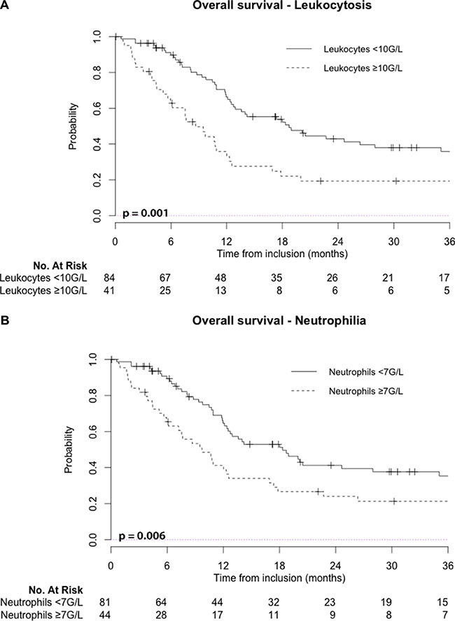 Patients underwent systematic complete blood cell counts weekly during chemoradiation. Pretreatment blood samples taken before any chemotherapy were employed in the current analysis. Leukocytosis and neutrophilia, defining biological inflammation, were defined as blood count over 10 G/L and 7 G/L, respectively. Anemia was defined as hemoglobin count below 12.0 g/dL; thrombocytosis as platelet count over 400,000 /mm3; lymphopenia as lymphocyte count below 1,000 /mm3; and monocytosis as monocyte count over 1,000 /mm3. We excluded from the analysis patients who received neoadjuvant chemotherapy or corticosteroids, presented chronic inflammation, were under treatment for an immune disease, or presented acute or chronic infection (including Human Immunodeficiency Virus). We also excluded patients with a history of neoplasia or medication which may confound the analysis (G-CSF, antibiotics for a recent infection).