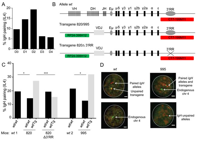 Figure 1: 3’RR dependent IgH pairing in wt and transgenic B-cells. A. Kinetic of IgH alleles pairing in in vitro activated wt B-cells. Wt B splenocytes were stimulated 4 days in vitro with anti-CD40 + IL4 and IgH localization was studied by 3D FISH. IgH pairing (distance ≤ 1 µm) was quantified in resting (day 0) and activated B cells (D1, D2, D3, D4). Bars represent % of pairing from 2 experiments with at least 585 cells analyzed. B. Schematic representation of alleles and probes used for 3D FISH experiments (not scaled). Wt alleles contain all V(D)J genes, constant genes and 3’RR, transgenes include a rearranged VDJ gene, constant genes and 3’RR (820 and 995 transgenes) or not (820Δ transgene). Probes are specific for IgH (CT7-199M11, red) or for transgene integration site (RP24-398H12, green, chromosome 4). C. IgH pairing in in vitro activated B lymphocytes. Cells were analyzed at day 2 and IgH pairing (distance ≤ 1 µm) between wt and wt alleles (black) or between wt and transgenic alleles (grey) were quantified by 3D FISH. In a first set of experiments wt cells (wt1) were compared to 820 and 820Δ transgenic cells and in a separated experiment wt cells (wt2) were compared to 995 transgenic cells. Bars represent % of pairing from 2 experiments, with at least 50 cells per group. DNA probes used were BAC CT7-199M11 for 3´ IgH and BAC RP24-221C18 close to the insertion site of the IgH transgene on chromosome 7 or BAC RP24-398H12, which is located adjacent to the insertion site of the IgH transgene on chromosome 4. Fisher exact test for significance. D. Representative nuclei from 3D FISH experiments on in vitro activated B-cells (day 2). Examples of pairing between endogenous IgH alleles in wt cells and between transgene and IgH alleles in 995 transgenic cells are shown. IgH loci are in red, transgene and endogenous chromosome 4 are in green. Scale bar: 1µm.