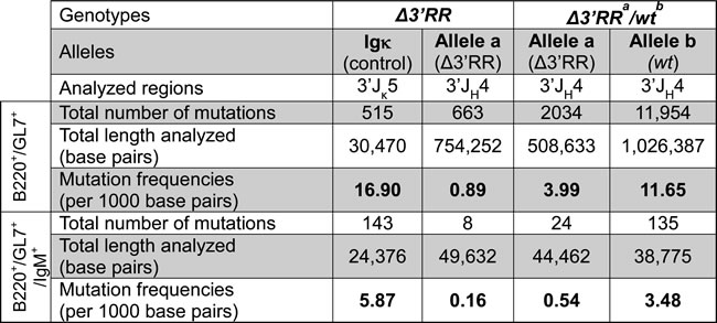 Mutation frequencies in 3’JH4 and 3’Jκ5 introns in B220+/GL7+ and B220+/GL7+/IgM+ cells from homozygous ∆3’RR and ∆3’RRa/wtb mice. Data were obtained from at least 2 experiments, ≥2 mice per group, with clonally related sequences counted only once.