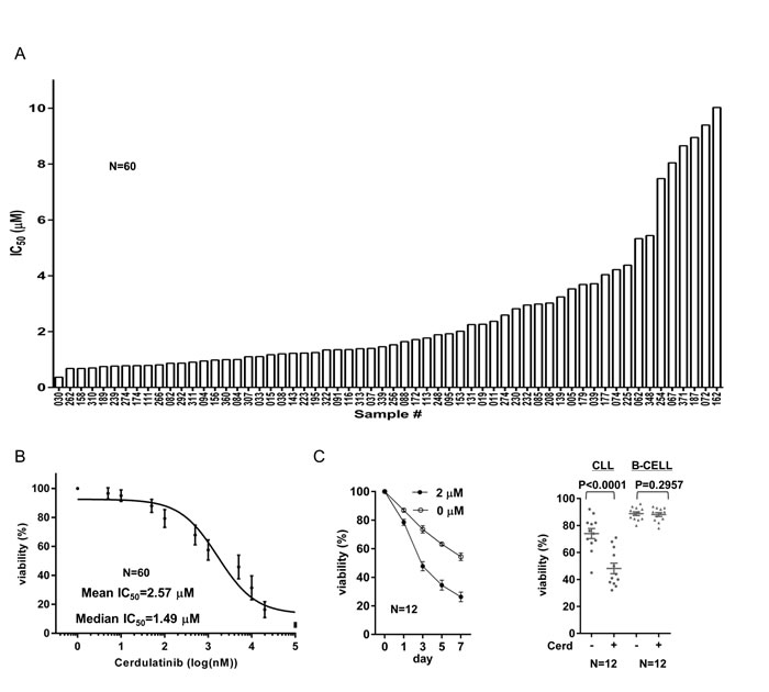 Cerdulatinib is a novel orally available, ATP-competitive, small-molecule inhibitor that demonstrates selective inhibition of SYK and JAK kinases with IC50 of 32 nM for SYK and 0.5-12 nM for JAKs [24]. Its selectivity in the cellular context was also demonstrated by the lack of inhibition of T-cell receptor signaling or protein kinase C signaling in whole blood [24]. In a mouse model, it blocks B-cell activation and alleviates splenomegaly induced by chronic BCR stimulation [24]. In human lymphoma cell lines and primary lymphoma cells, cerdulatinib demonstrates broad anti-tumor activity in diffuse large B-cell lymphoma including GCB and ABC tumor cells with ibrutinib-resistant MYD88 or CARD11 mutations [25] . In CLL, we showed that cerdulatinib blocks proliferation of BTKC48S-bearing ibrutinib-resistant cells isolated from an ibrutinib-relapsed patient [14]. Herein, we further investigate the effects of dual SYK and JAK inhibition in a collection of 60 CLL patient samples in comparison to ibrutinib. We demonstrate that cerdulatinib has additional anti-tumor activities compared to ibrutinib and the compound shows great potential in overcoming ibrutinib resistance.