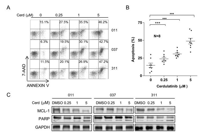 Figure 2: Cerdulatinib induces apoptosis in CLL in association with MCL-1 down-regulation and PARP cleavage. A. Cerdulatinib induces apoptosis. Apoptosis was assessed by annexin V/7-AAD staining following cerdulatinib treatment for 48 hrs. Three representative cases are shown. The percentage of early apoptotic annexin-Vhi/7AAD low population in the bottom right quadrant is indicated. B. Dose response of 8 CLL samples at indicated concentrations of cerdulatinib post 48 hr of treatment. Data presented represent mean ± SE of apoptosis. ***, P < 0.001. C. Immunoblots of MCL-1 and PARP. Following cerdulatinib treatment for 48 hrs at indicated concentrations, MCL-1 and PARP1 cleavage were measured by Western blot in whole cell lysates. GAPDH was included as the loading control.
