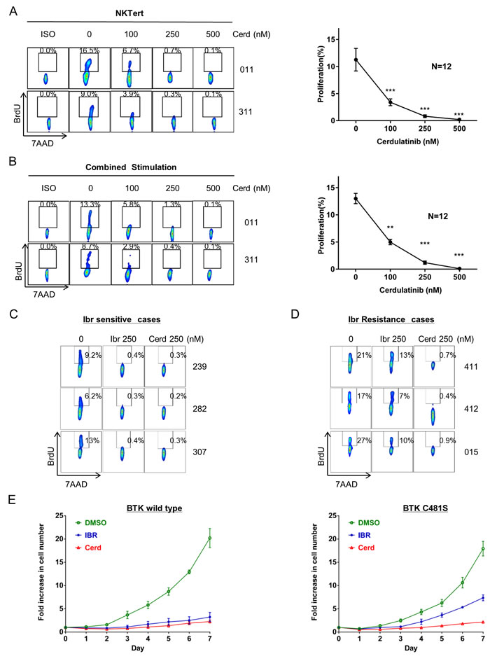 Figure 4: Cerdulatinib blocks proliferation of ibrutinib-sensitive and ibrutinib-resistant primary CLL cells. A. Cell proliferation following increasing concentrations of cerdulatinb in the presence of NKTert co-cultures. BrdU incorporation was measured following 20 days of treatment. Left panel, two representative cases are shown. Right panel, aggregate data of 12 CLL cases analyzed with ANOVA test. Values in the line graph represent mean+SE. ***P < 0.001. B. Cell proliferation following increasing concentrations of cerdulatinb in the presence of combined stimulation. Cells were treated with plate-bound anti-IgM combined with IL4, CD40L and CpG in the presence of cerdulatinib and BrdU for 8 days followed by flow cytometric analysis for BrdU incorporation. Left panel. two representative cases are shown. Right panel, aggregate data of 12 CLL cases analyzed with ANOVA test. Values in the line graph represent mean+SE. **P < 0.01 and ***P < 0.001. C. Sensitivity of three ibrutinib-sensitive cases to cerdulatinib. A low in vivo achievable concentration of 250 nM was chosen to match that of ibrutinib. D. Sensitivity of three ibrutinib-resistant (both clinically resistant and resistant by this assay) to cerdulatinib. (C&D) Cells were treated with either 250 nM ibr or cerdulatinib in the presence of combined stimuli. BrdU incorporation was measured at day 8. E. Effects of ibrutinib and cerdulatinib in WT BTK-transfected TMD8 cells (Left) and in BTKC481S -transfected cells (Right). 250nM of ibrutinib or cerdulatinib was added into the culture and live cell number was counted daily for 7 days. The results shown are the mean+SE of 4 replicate experiments.