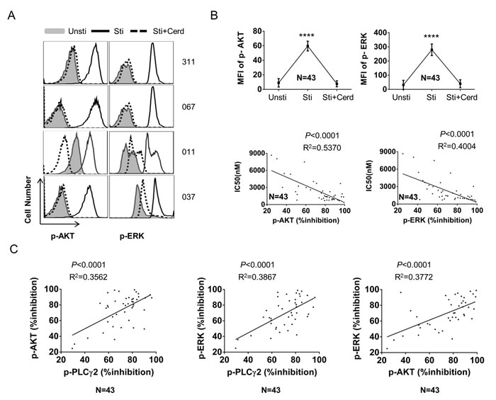 BCR or cytokine signaling directly or indirectly leads to downstream activation of AKT and ERK [6, 21, 24]. We thus examined whether activity of AKT and ERK was inhibited by cerdulatinib. Phosphorylation of AKT and ERK was assessed by phospho-flow, a sensitive and quantitative assay. As illustrated with four representative cases in Figure 6A, activity of AKT and ERK was significantly increased by combined stimulation (black open peak vs grey shaded peak), and this increase was significantly reduced or even completely abolished by cerdulatinib (dot-outlined peak vs black open peak). Data derived from 43 CLL cases were summarized (Figure 6B top). Similar to PLCγ2, the degree of both p-AKT and p-ERK inhibition is inversely correlated with the IC50 of cerdulatinib in 43 CLL samples suggesting the anti-tumor effect of cerdulatinib relates to its inhibition of distal signal transducers AKT and ERK (Figure 6B bottom). We also analyzed the quantitative relationship between the degree of p-PLCγ2, p-AKT and p-ERK inhibition. Statistical analysis revealed a significant linear inter-correlation between all three parameters suggesting the three signaling molecules are interrelated in the same network that is inhibited by cerdulatinib (Figure 6C).