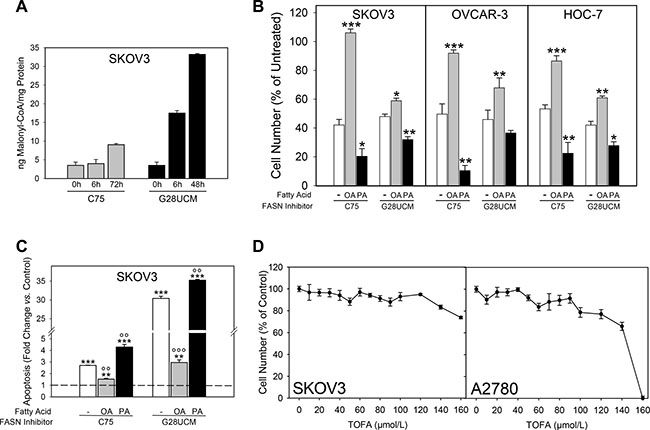 Figure 1: The degrees of accumulation of malonyl-CoA and depletion of oleic acid (OA) upon inhibition of fatty acid synthase (FASN) in ovarian cancer (OC) cells depend on the particular inhibitors used. (A) Malonyl-CoA is quickly and strongly accumulated by G28UCM, but much less by C75. (B) Supplementation of OA, unlike PA, antagonizes C75-mediated growth inhibition more efficiently than G28UCM-mediated growth inhibition. Data obtained after exposure to C75 (80 μM for SKOV3 and HOC-7, 40 μM for OVCAR-3) or G28UCM (80 μM for SKOV3, 15 μM for OVCAR-3, 30 μM for HOC-7) ± 70 μM OA or PA are presented. 1.5 × 10³ (SKOV3, OVCAR-3) or 0.5 × 10³ (HOC-7) cells/well were seeded in a 96 well plate and treated for 72 h. Note: In these experiments cultures contained bovine serum albumin (for details of dissolving fatty acids see Materials and methods), which lowers the efficacy of FASN-inhibitors [38]. Therefore, higher concentrations of C75 and G28UCM had to be applied in order to achieve marked inhibition of cell growth. Data from untreated controls (not shown in chart) were set to 100% and those from treated cultures were related to it. Means ± SD, n = 3. *p < 0.05, **p < 0.01, ***p < 0.001 FASN-inhibitor alone vs. FASN-inhibitor combined with OA or PA. One-way ANOVA and Scheffe-test. (C) C75 is a weak inducer of apoptosis compared to G28UCM. Moreover, OA fully abrogates C75-induced cell death, but only partially inhibits G28UCM-mediated apoptosis. Means ± SD, n = 3. **p < 0.01, ***p < 0.001 treated vs. untreated control (dashed horizontal line at y = 1). °°p < 0.01, °°°p < 0.001 FASN-inhibitor alone vs. FASN-inhibitor combined with OA or PA. One-way ANOVA and Scheffe-test. (D) Growth inhibition of OC cells after 72 h exposure to TOFA, an inhibitor of acetyl-CoA carboxylase.