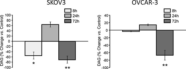 Figure 2: Large fluctuations of DAG upon inhibition of FASN by G28UCM as demonstrated by thin-layer chromatography in SKOV3 (left) and OVCAR-3 (right). Values represent % change of total DAG in treated cells relative to untreated control cells (horizontal 0-line). Means ± SD, n = 3. *p < 0.05, **p < 0.01 vs. control cells, one-way ANOVA and Scheffe-test.