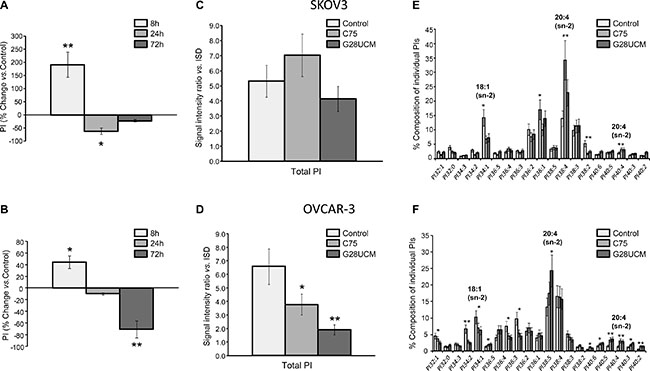 Figure 3: FASN-inhibitors G28UCM and C75 down-regulate total phosphatidylinositol (PI) levels and alter the composition of individual PI species in SKOV3 (upper row-A, C, E) and OVCAR-3 (lower row-B, D, F) cells as demonstrated by MALDI-QIT-TOF-MS/MS analysis. (A, B) Time-course analyses revealed similar ‘bi-phasic response profiles’ of total PI in both cell lines with initial up-regulation at 8 h followed by sharp reductions at 24 and 72 h of exposure to G28UCM relative to untreated control cells (horizontal 0-line). (C, D) Long-term reduction of PI levels after 72 h treatment was less pronounced in SKOV3 (C) than in OVCAR-3 cells (D). ISD internal lipid standards. (E, F) Similar drug-induced changes in the composition of individual PI species were seen after 72 h in both SKOV3 (E) and OVCAR-3 (F) cells including reduction of MUFAs (e.g. OA, 18:1) and enrichment of PUFAs (e.g. arachidonic acid, 20:4). C75 and G28UCM were applied at concentrations that block growth by 60–70% after 72 h (40 μM for SKOV3 and 20 μM for OVCAR-3) [16]. For further details see also Supplementary Table 1. Means ± SD, n = 3. *p < 0.05, **p < 0.01 vs. untreated control cells, one-way ANOVA and Scheffe-test.