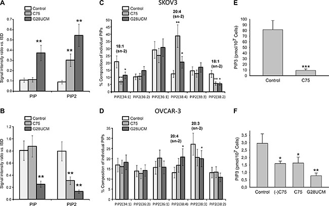 Figure 4: The effects of FASN-inhibitors G28UCM and C75 on the phosphorylated derivatives of phosphatidylinositol [PIP = PI(4)P, PIP2 = PI(4,5)P2, PIP3 = PI(3,4,5)P3] in SKOV3 (upper row A, C, E) and OVCAR-3 (lower row B, D, F) cells as demonstrated by MALDI-QIT-TOF-MS/MS analysis using ‘internal lipid standards’ (ISD) for quantitative evaluation. (A, B) FASN-inhibition causes up-regulation of PIP and/or PIP2 in SKOV3 (A) but down-regulation in OVCAR-3 (B). (C, D) Yet, similar drug-induced changes in composition of PIP2 were seen in both cell lines including depletion of lipids containing 18 : 1 and enrichment of those containing 20 : 4 fatty acids. The most prominent fatty acid residues esterified to the sn-2 position of the glycerol backbone of the PIP2 molecules are indicated. Culture conditions were as in Figure 3. (E, F) Exposure for 24 h to FASN-inhibitors C75, (-)C75, or G28UCM down-regulates the amount of PIP3 in SKOV3 (E) and OVCAR-3 (F) cells relative to vehicle control (< 0.1% DMSO) as demonstrated by a competitive PIP3 mass ELISA. Means ± SD, n = 3. *p < 0.05, **p < 0.01, ***p < 0.001 vs. vehicle control cells, one-way ANOVA followed by Scheffe test (A–D and F) or Student‘s t test (E).