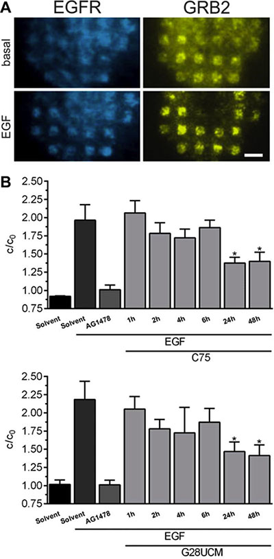 Signal initiating molecules such as the epidermal growth factor (EGF) receptor (EGFR) tyrosine kinase are embedded in multi-molecular complexes that are anchored in membrane microdomains known as lipid rafts. FASN-blockade lowers the membrane lipid content. This leads to decomposition of the lipid rafts [26] and to reduced receptor phosphorylation [14]. Here we applied a live-cell micropatterning assay [27–29] to evaluate the role of FASN-blockade on recruitment of GRB2 to EGFR. SKOV3 cells co-expressing EGFR-CFP and GRB2-YFP were grown on anti-EGFR antibody coated micro-biochips and accumulation of GRB2 in EGFR-microdomains was observed by total internal reflection fluorescence microscopy. Figure 5 reveals that EGF (17 nM, 15 min)-induced tethering of GRB2-YFP to EGFR-CFP is prevented not only by pretreatment with the EGFR-inhibitor AG1478 (10 μM, 4 h), but also by the FASN-inhibitors C75 and G28UCM. Decrease of the fluorescence contrast (c/c0) is already observed after 2 hours and reaches statistical significance after 24 hours of treatment (Figure 5B).