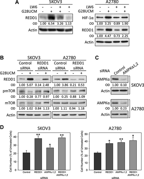 Western blotting was used to examine FASN-blocker-mediated inhibition of PI3K-AKT-mTORC1. Thereby, we aimed to identify effector molecules that directly link FASN pathways to mTORC1. In SKOV3 cells treated with G28UCM we observed a rapid dose-dependent induction of HIF-1α and of its target gene, the stress response protein REDD1 (DDIT4, RTP801) (Figure 6A). Figure 7A reveals that blockade of HIF-1α with the specific inhibitor LW6 prevents G28UCM-mediated induction of REDD1 indicating that REDD1 up-regulation is mediated by HIF-1α. Accordingly, both proteins accumulate within the first hour of FASN-inhibition. However, after 72 h, both HIF-1α and REDD1 are decreased relative to control cells (Figure 6A). Concurrently, phosphorylation of AMPK, which signifies shortage of bioenergy, becomes stimulated. Both REDD1 and pAMPK are repressors of mTORC1. Consequently, phosphorylation of the mTORC1 effector ribosomal protein S6 is decreasing as soon as REDD1 is up-regulated and remains low due to ensuing suppression through pAMPK. Reduction of mTOR and of the mTOR binding partner DEPTOR has been observed after 2–3 days of treatment confirming robust impairment of the mTOR pathway (Figure 6A, 6B). Cleaved fragments of caspase 3 and PARP–two hallmarks of apoptosis–occur approximately 24 h post-treatment. At that time mTORC1 activity has already been impaired (Figure 6A). Similar molecular changes are found in G28UCM-and C75-treated A2780 or OVCAR-3 cells (Supplementary Figure 5). Moreover, the effects are independent of the presence or absence of exogenous growth factors and can also be observed after RNAi knock-down of the FASN gene (Figure 6B and Supplementary Figure 6). Genetic knock-down of REDD1 or AMPKα1/2 reverts G28UCM-mediated mTOR dephosphorylation and growth arrest (Figures 7B–7D). However, concurrent knock-down of both REDD1 and AMPKα1/2 does not yield stronger reversal of growth inhibition (Figure 7D). These data indicate that REDD1 and AMPK are interfering with the very same pathway, namely mTORC1, which essentially contributes to cell death. In contrast, carboplatin, a DNA-cross linking chemotherapeutic drug with an unrelated mechanism of action, induces growth arrest and apoptosis, but does not elevate HIF-1α, REDD1 or pAMPKα, nor does it impede phosphorylation of S6 downstream of mTORC1 (Supplementary Figure 7).