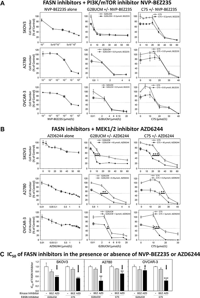Figure 8: The effect of the dual PI3K/mTOR kinase inhibitor dactolisib/NVP-BEZ235 and of the MEK1/2 kinase inhibitor selumetinib/AZD6244 on the anti-proliferative effects of the FASN-blockers G28UCM and C75 as demonstrated by formazan dye assay. SKOV3, A2780 or OVCAR-3 cells were treated for 72 h with NVP-BEZ235 (A) or AZD6244 (B) alone (left charts), or with G28UCM (center charts) or C75 (right charts) alone or together with NVP-BEZ235 or AZD6244. A circle symbol as given in the original manuscript and in the corresponding diagrams marks the fixed concentration of the kinase inhibitors chosen for combination with various doses of the FASN-inhibitors. In (C) a comparison of the relative IC50 values of the FASN-blockers G28UCM and C75 in the absence (arbitrarily set at y = 1) or presence of NVP-BEZ235 (BEZ) or AZD6244 (AZD) is given. Note: only AZD6244 can significantly lower the IC50 values of the FASN-inhibitors G28UCM and C75 (←). Means ± SD, n = 3. *p < 0.05, **p < 0.01, ***p < 0.001 presence (AZD) vs. absence of AZD6244 (−), one-way ANOVA followed by Scheffe test.