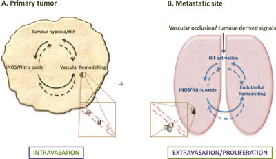 Key questions remain when characterizing the role of the vasculature in metastatic disease, e.g. what roles do EC-specific HIF and NO play during intravasation, and what cell-specific molecular signalling pathways regulate the extravasation and viability of colonizing cancer cells? Although mechanisms that regulate endothelial HIF/NO-mediated cancer progression are not fully understood, therapeutic or gene-mediated disruption of this signalling cascade could potentially reduce metastatic success (Figure 2).