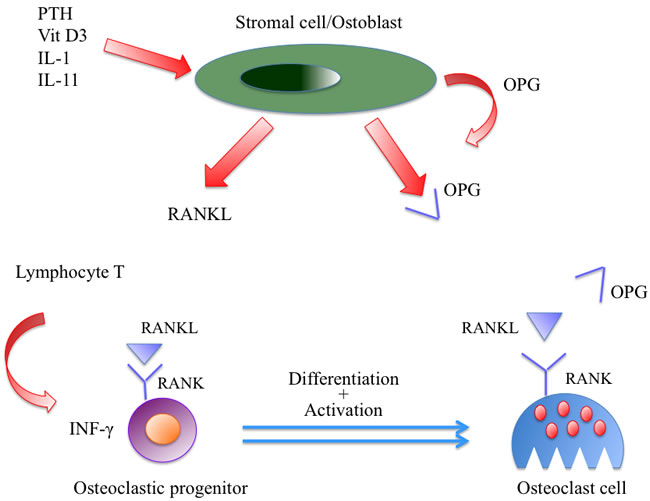Osteoclast activation contributes to the decrease of bone matrix and ultimately to osteolysis. In normal conditions, osteoclast differentiation and activation are controlled by stromal cell/osteoblast through the Receptor Activator of NF-κB Ligand (RANK-L)/RANK/osteoprotegerin (OPG) system [38-41]. Osteocytes are the major source of the osteoclastogenic cytokine RANK-L [42, 43]. The specific receptor of this protein, RANK, is located on osteoclast progenitors and its stimulation leads to differentiation into mature and active osteoclasts [40, 41, 44]. RANK-L activity is physiologically countered by interferon-gamma (INFγ), which regulates osteoclast formation by preventing excessive bone resorption [39-41].
