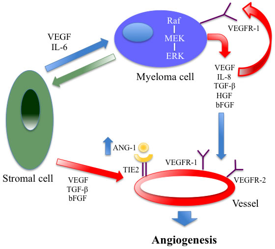 VEGF-a is also an important communication signal between stromal and myeloma cells, inducing the microenvironment to produce the same VEGF, but also other proangiogenic factors, such as FGF-β and TGF-β [129]. Furthermore, VEGF-a has an autocrine effect on the neoplastic cell, mediated by VEGFR-2 and the intracellular transmission pathway RAF-1/MEK-1, which would strengthen further angiogenic stimulus [129].