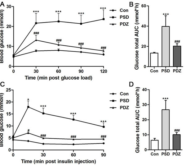 Figure 1: Effects of ZBPYR on glucose tolerance and insulin resistance in ZDF rats. A. B. Oral glucose tolerance tests were examined in 14-hr-fasted rats after 10 weeks with high-fat diet. A: Blood glucose levels, B. Total glucose area under the curve (AUC). C. D. Insulin tolerance tests were conducted on 6-hr-fasted animals. C. Blood glucose levels, D. Total glucose AUC. Black circles, control (n = 3); black squares, PSD group (n = 3); black triangles, PDZ group (n = 3). *P < 0.05, ***P < 0.001 PSD vs. Con; #P < 0.05, ###P < 0.001 PDZ vs. PSD. Con: control ZDF rats; PSD: ZDF rats treated with PS; PDZ: ZDF rats treated with PS combining ZBPYR administration.