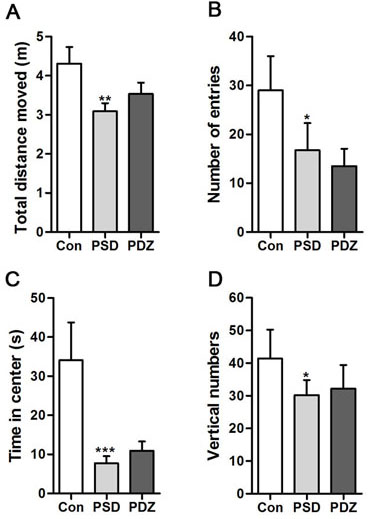 Figure 2: Parameters of activities in the open field test. Total distances moved in the open field were measured. Vertical numbers during the experiment and numbers of entries into the center of the open field were counted. Time spent in the center of the open field was calculated. *P < 0.05, **P < 0.01, ***P < 0.001, PSD, PDZ vs. Con. Con: control ZDF rats; PSD: ZDF rats treated with PS; PDZ: ZDF rats treated with PS combining ZBPYR administration.