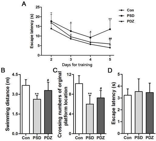 Figure 3: ZBPYR improves the performance of PSDACD rats in the Morris water maze test. A. Learning performance of the animals was analyzed in the training trials by escape latency. PDZ rats presented shorter escape latency on the 4th and 5th day of training Black circles, control (n = 3); black squares, PSD group (n = 3); black triangles, PDZ (n = 3). B. C. Memory performance was investigated in the probe test. B: The swimming distances in training trials, C. The numbers of crossing over the original platform location. D. Escape latency was evaluated in the visible platform version of the Morris water maze. *P < 0.05, **P < 0.01 PSD vs. Con; #P < 0.05, ##P < 0.01 PDZ vs. PSD. Con: control ZDF rats; PSD: ZDF rats treated with PS; PDZ: ZDF rats treated with PS combining ZBPYR administration.