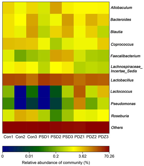 Figure 5: The heat map of 16S rRNA gene sequencing analysis of colonic mucosa at the genus level. Heat map of the relative abundance of microbial species altered by PSDACD and ZBPYR treatment. Red colors indicate high values, whereas blue colors mean low values for the percent of reads classified at that rank.