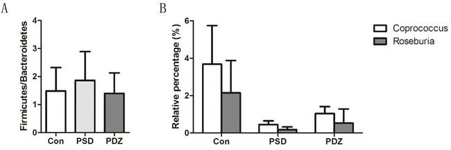 Heat map of the relative abundance of microbial species altered by PSDACD and ZBPYR treatment showed the differences of gut bacterial compositions compared among Con group, PSD group and PDZ group at the genus level (Figure 5). Consistent with previous reports, we found that the Firmicutes/ Bacteroidetes ratio was higher in PSD group compared with control group, in addition, it was recovered by ZBPYR administration in PDZ group (Figure 6A). The relative percentage of Roseburia was less in model group than that in control group (0.18% vs. 2.15%, Figure 6B), in contrast greater numbers of Roseburia were detected in PDZ group compared with PSD group (0.53% vs. 0.18%, Figure 6B). Interestingly, the analysis of Coprococcus followed similar trends as the relative percentage of Roseburia. These results confirmed that the homeostasis of the gut microbiota in PSDACD individuals was destroyed. ZBPYR could effectively manipulate the gut microbiota imbalance caused by PSDACD, mainly acting on Roseburia and Coprococcus.