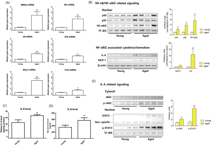 To confirm age-related NF-κB target genes expression using RNA-Seq data, quantitative PCR was performed. The genes were selected based on associations with NF-κBIZ or with other well-known target genes of NF-κB. As shown in Figure 1, NF-κBIZ and its related genes (IL-6, MCP-1, and IL-6R) were all significantly up-regulated during renal aging. TNFα and IL-1β were also up-regulated, but to a lesser extent than NF-κBIZ related genes (Figure 1A). These results indicate the importance of NF-κBIZ and its related proteins, and confirm RNA-Seq data from NGS. To further confirm the role of increased NF-κBIZ in aged kidneys, the protein expression of NF-κBIZ and its related cytokine changes were examined in young and old rat kidneys. In agreement with previous results [20], nuclear p65 and p50 protein levels increased with aging (Figure 1B). In addition, the expression of NF-κBIZ protein was elevated in the nuclear fractions of aged kidneys, which concurred with qPCR data (Figure 1B). Furthermore, the protein levels of NF-κBIZ related cytokines were also up-regulated in aged kidney (Figure 1B, 1C). Serum IL-6 levels were also increased in aged rat (Figure 1D). To further assess the effects of increased levels of NF-κBIZ-related cytokines, the activation of IL-6 signaling was investigated in young and old rat kidneys. The activation of IL-6 by its receptor leads to the phosphorylation of JAK2 and the nuclear translocation of STAT3. Aged kidneys showed increased JAK2 phosphorylation and significantly higher levels of STAT3 and of phosphorylated STAT3 in nuclear fractions (Figure 1E). These findings confirm that the up-regulations of NF-κBIZ and of its related cytokines induces IL-6, and thus, upregulates the JAK2/STAT3 signaling pathway in the kidneys of aged rats.