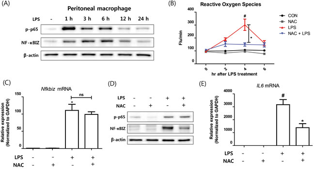Figure 3: Effect of oxidative stress on NF-κBIZ activation in macrophages. A. Western blotting was performed to examine the time-dependent expression of NF-κBIZ and p65 activation in LPS treated macrophages. β-Actin was used as the loading control. B. Oxidative stresses were measured using DCFDA in LPS-treated macrophages pretreated or not with NAC. Data are expressed as means ± SEMs. *P < 0.05 vs. non-treated macrophages. #P < 0.05 vs. LPS treated macrophages. C. Nfkbiz mRNA levels were assessed by qPCR in LPS-treated macrophages pretreated with or without NAC. Results were normalized versus Gapdh. *P < 0.05 vs. non-treated macrophages. D. Western blotting was performed to investigate the effects of NAC on the protein expression of NF-κBIZ and activation of p65 in LPS treated macrophages. β-Actin was used as the loading control. E. mRNA expressions of Il6 were measured by qPCR in LPS-treated macrophages pretreated with or without NAC. Data are expressed as means ± SEMs. *P < 0.05 vs. non-treated macrophages. #P < 0.05 vs. LPS treated macrophages.