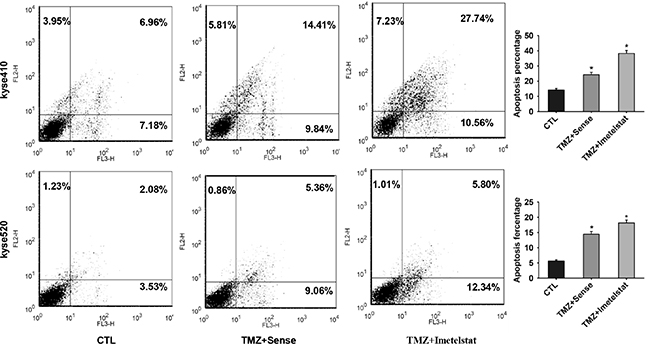 Figure 2: Imetelstat increases cell apoptosis of Kyse410 and Kyse520 cell. Kyse410 and Kyse520 cells were incubated and treated with 5 μM sense or imetelstat for 72 h and at the same time exposed to 10 μM TMZ. Results of early and late apoptosis were added together to calculate the total amount of apoptosis. Values represent the mean±SD and are representative of three independent experiments. *p < 0.05, statistical significance was established by t test.