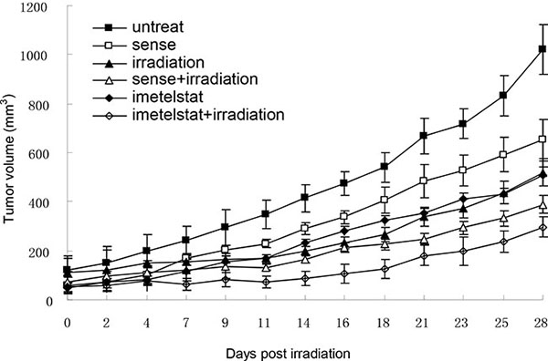 Figure 4: Imetelstat sensitizes esophageal cancer cell Kyse520 to radiation in vivo. Kyse520 cells were pretreated with imetelstat or sense for 7 weeks before injected into nude mice to form tumors. When the size of tumor reached approximately 50 mm3, mice were randomly divided into 6 different groups, including untreated group, radiation group, sense group, imetelstat group, sense + radiation group and imetelstat + radiation group. Tumors in nude mice were subjected to 2 Gy of irradiation for 5 consecutive days to mimic a fractionated weekly scheme. The sizes of tumor were measured 3 times per week to obtain cell growth curve. At days 13, 31 and 45 postinjection, imetelstat were injected intraperitoneally to ensure inhibition of telomerase activity. Data are presented as mean tumor volume ± SE. Imetelstat with irradiation significantly decreased tumor growth compared with mice receiving irradiation alone or irradiation with sense (p < 0.05).