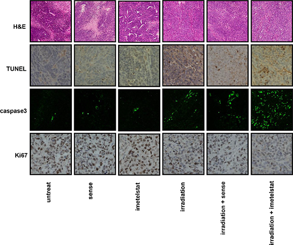 Apoptotic cells were labeled by TUNEL assay as shown in Figure 5. Although TUNEL staining for tumor treated with sense or imetelstat showed relatively small number of apoptotic cells, the enhanced staining intensity in imetelstat group was still stronger than that in the sense group. Moreover, tumor exposed to the combination of radiation and sense also showed less apoptosis staining than those subjected to imetelstat/radiation. The apoptosis induced by imetelsat and radiation was further analyzed by using caspase3 immunofluorescence staining. The expression of caspase3 in radiation-treated tumor in vivo was up-regulated, while imetelstat promoted radiation-induced cell apoptosis as reflected by the further up-regulated level of caspase3 (Figure 5). More importantly, the expression of caspase3 in imetelstat/radiation group was much higher than that in the sense/radiation group, which implies more apoptosis. Tumor subjected to sense or imetelstat only showed almost no expression of caspase3, which confirmed that imetelstat was not toxic to mice in vivo and the principal function of it was enhancing tumor sensitivity to radiation therapy.