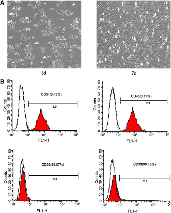 Figure 1: Observation of BMSCs through an electron microscope and flow cytometry assay. Note: (A) electron microscope photograph of cell 3 and 7 days after cultivation; (B) flow cytometry diagram of surface antigens; BMSCs, bone marrow-derived mesenchymal stem cells.
