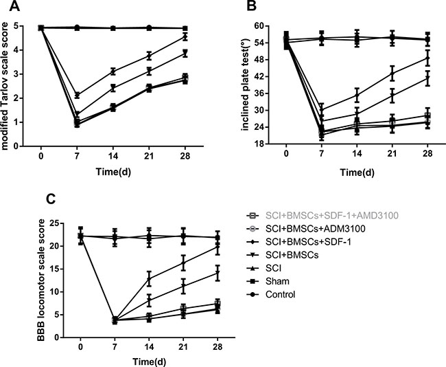 Figure 2: Comparison of hind limb motor function over time among the blank control, sham, SCI, SCI + BMSCs, SCI + BMSCs + SDF-1, SCI + BMSCs + AMD3100 and SCI + BMSCs + SDF-1 + AMD3100 groups. Note: (A) a modified Tarlov scare score picture of hind limb motor function; (B) modified inclined plate test picture of hind limb motor function; (C) BBB locomotor scale score picture of hind limb motor function; BBB, Basso, Beattie and Bresnahan; BMSCs, bone marrow-derived mesenchymal stem cells; SCI, spinal cord injury; SDF-1, Stromal cell-derived factor-l.
