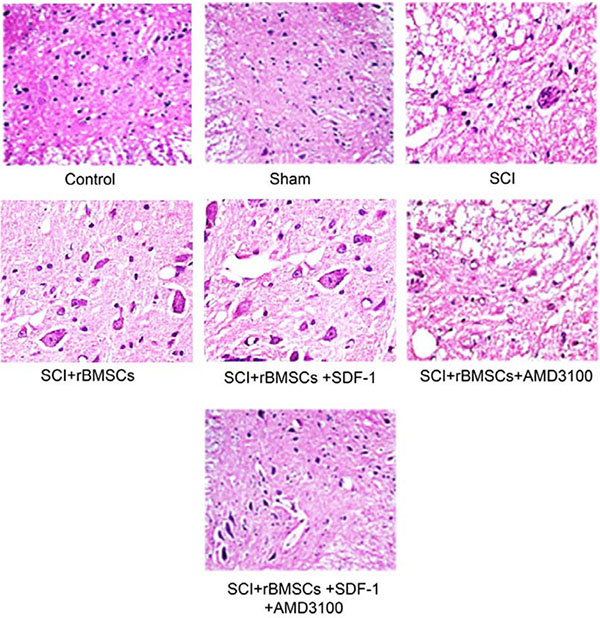 Figure 3: Comparison of the inflammatory reaction 28 days after model establishment detected through HE staining among the blank control, sham, SCI, SCI + BMSCs, SCI + BMSCs + SDF-1, SCI + BMSCs + AMD3100 and SCI + BMSCs + SDF-1 + AMD3100 groups. Note: HE, hematoxylin and eosin; BMSCs, bone marrow-derived mesenchymal stem cells; SCI, spinal cord injury; SDF-1, Stromal cell-derived factor-l.
