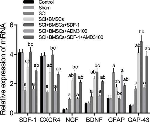 Figure 4: Comparison of the mRNA expression of SDF-1, CXCR4, NGF, BDNF, GFAP and GAP-43 detected using qRT-PCR among the blank control, sham, SCI, SCI + BMSCs, SCI + BMSCs + SDF-1, SCI + BMSCs + AMD3100 and SCI + BMSCs + SDF-1 + AMD3100 groups. Note: SDF-1, stromal cell-derived factor-1; CXCR4, chemokine receptor-4; GFAP, glial fibrillary acidic protein; GAP-43, Growth associated protein-43; NGF, Nerve growth factor; BDNF, brain derived neurotrophic factor; BMSCs, bone marrow-derived mesenchymal stem cells; SCI, spinal cord injury; SDF-1, Stromal cell-derived factor-l; qRT-PCR, quantitative real-time polymerase chain reaction; acompared with the blank control and sham groups, P < 0.05; bcompared with the SCI and SCI + BMSCs + AM 3100 groups, P < 0.05; ccompared with the SCI + BMSCs and SCI + BMSCs +SDF-1+ AM 3100 groups, P < 0.05.