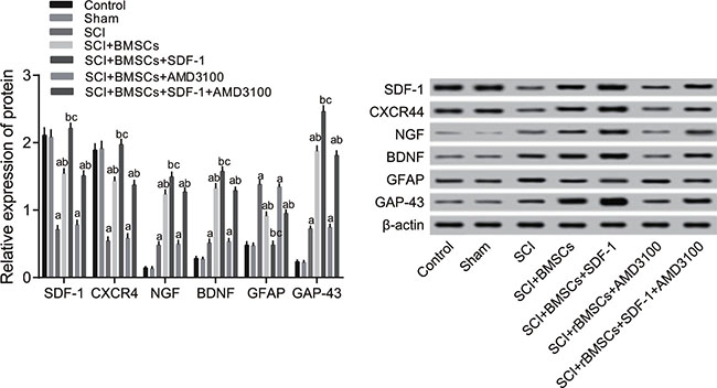 Figure 5: Comparison of the protein expression of SDF-1, CXCR4, NGF, BDNF, GFAP and GAP-43 detected through western blotting among the blank control, sham, SCI, SCI + BMSCs, SCI + BMSCs + SDF-1, SCI + BMSCs + AMD3100 and SCI + BMSCs + SDF-1 + AMD3100 groups. Note: SDF-1, stromal cell-derived factor-1; CXCR4, chemokine receptor-4; GFAP, glial fibrillary acidic protein; GAP-43, Growth associated protein-43; NGF, Nerve growth factor; BDNF, brain derived neurotrophic factor; BMSCs, bone marrow-derived mesenchymal stem cells; SCI, spinal cord injury; SDF-1, Stromal cell-derived factor-l; acompared with the blank control and sham groups, P < 0.05; bcompared with the SCI and SCI + BMSCs + AM 3100 groups, P < 0.05; ccompared with the SCI + BMSCs and SCI + BMSCs +SDF-1+ AM 3100 groups, P < 0.05.