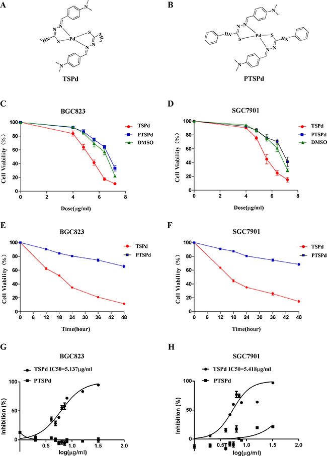 Figure 1: Effect of the target complexes on cell viabilities of human gastric carcinoma cells. (A, B) Molecular structures of the two Pd (II) complexes, DMABTSPd(TSPd) and DMABPTSPd (PTSPd). (C, D) BGC823 and SGC7901 cells were treated with different doses of target complexes (0, 4.0, 4.8, 5.6, 6.4, and 7.2 μg/mL) and DMSO (the same volume as the highest drug dose). (E, F) BGC823 and SGC7901 cells were treated with 6.4 μg/mL target complexes for different time periods (0, 12, 24, 36, and 48 h). The cell viabilities were measured by an MTT assay as described in the Materials and Methods section. The data are representative of three independent experiments, each yielding similar results. G&H: BGC823 and SGC7901 cells were treated with the target complexes or DMSO at the indicated doses, followed by detection of the anticancer activity (IC50 values) as described in the Materials and Methods section. (G) The IC50 for DMABTSPd(TSPd) was determined to be 5.137 μg/mL (means ± S.D., n = 6) in BGC-823 cells. (H) The IC50 for DMABTSPd (TSPd) was determined to be 5.418 μg/mL (means ± S.D., n = 6) in SGC-7901 cells.