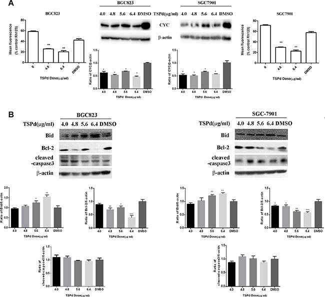 Figure 3: Effect of the target complexes on the mitochondrial signaling pathways in human gastric carcinoma cells. (A) BGC823 cells and SGC7901 cells were collected after treated with different doses of DMABTSPd(TSPd) (0, 4.8, and 6.4 μg/mL) for 24 h and analyzed for mitochondrial integrity by Rh123 retention as described in the Materials and Methods section. Meanwhile, cells were collected after treatment with different doses of DMABTSPd(TSPd) (4.0, 4.8, 5.0, and 6.4 μg/mL) for 24 h, followed with the detection of cytochrome C(CYC) expression with western blotting as described in the Materials and Methods section. (B) BGC823 cells and SGC7901 cells were collected after treatment with different doses of TSPd (4.0, 4.8, 5.0, and 6.4 μg/mL) for 24 h, and the levels of Bid, Bcl-2, and cleaved-caspase 3 expression were detected by western blotting as described in the Materials and Methods section. Data are as means ± S.D. of three separate experiments (*P < 0.05, **P < 0.01, ***P < 0.001, vs the control group).