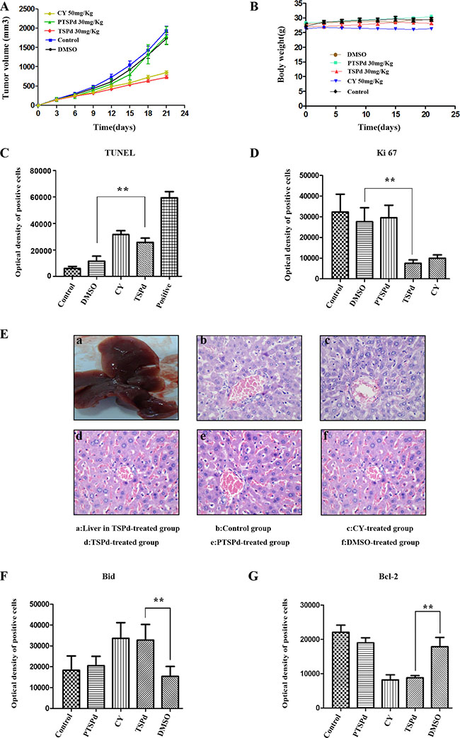 Figure 4: Effect of the target complexes on gastric cancer growth in a nude mouse tumor xenograft model. Typical photographs of tumor samples from the nude mice treated with the target complexes (30 mg/kg), CY(50 mg/kg), DMSO, and vehicle control, respectively. (A) Variations in the volume of tumor samples from nude mice treated with the target and control complexes respectively. (B) Variations in the body weight of nude mice treated with the target and control complexes respectively. (C) The optical density of apoptotic cells of tumor samples from nude mice was detected using the TUNEL assay as described in the Materials and Methods section. (a. negative group(PBS); b. control group; c. DMSO-treated group; d. CY-treated group(positive); e. DMABTSPd(TSPd)-treated group; f. positive sample provided by Roche Diagnostics). (D) The level of Ki67 expression of tumor samples from nude mice was detected using immunohistochemistry. (a. negative group(PBS); b. control group; c. DMSO-treated group; d. DMABPTSPd (PTSPd)-treated group; e. DMABTSPd(TSPd)-treated group; f. CY-treated group(positive)). (E) The histological structure of liver from nude mice (a.General observation of liver from the DMABTSPd(TSPd)-treated group. (b–f): Liver stained by hematoxylin and eosin as described in the experimental section (b. control group; c. CY-treated group(positive); d. DMABTSPd(TSPd)-treated group; e. DMABPTSPd (PTSPd)-treated group; f. DMSO-treated group). F&G: The level of Bid (F) and Bcl-2 (G) expression was detected using immunohistochemistry. (a. negative group(PBS); b. control group; c. DMABPTSPd (PTSPd)-treated group; d. CY-treated group(positive); e. DMABTSPd (TSPd)-treated group; f. DMSO-treated group). Data are as means ± S.D. of each group (*P < 0.05, **P < 0.01, vs DMSO-treated group, magnification × 400).