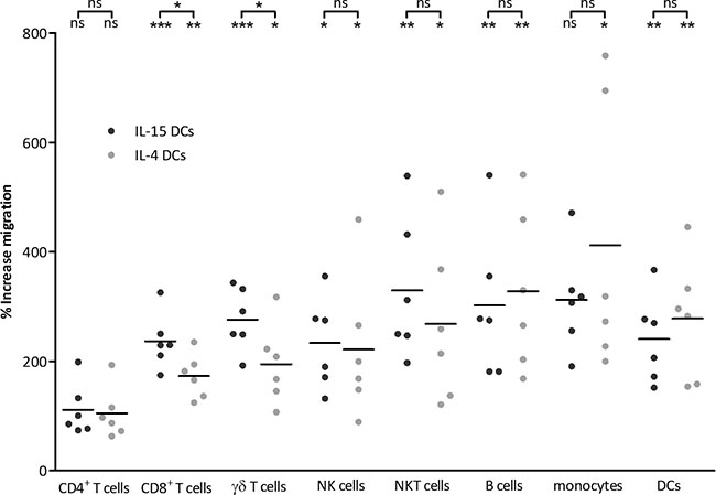 Figure 1: Immune effector cells are recruited by IL-15 DCs. 48-hour wash-out supernatant of IL-15 DCs and IL-4 DCs was used in a three-hour 5 μm pore size transwell chemotaxis assay with PBMC. Scatter dot plots (line at mean) represent the % increase of migration, calculated as (number of migrated cells in the specific condition / number of migrated cells in the negative control) × 100, of viable migrated PBMC subsets (n = 6), with the negative control representing spontaneous migration towards medium. Immune cells recruited by IL-15 DC and IL-4 DC wash-out supernatant are depicted as dark grey and light grey spheres, respectively. Repeated measures ANOVA with Bonferroni’s Multiple Comparison Testing was used for statistical analysis. Statistics depicted on top of the brackets represent differences between migration towards supernatant of IL-15 DCs versus IL-4 DCs, whereas statistics of migration towards each DC type as compared to the medium control is noted below the brackets. ***p < 0.001, **p < 0.01, *p < 0.05, ns, p > 0.05