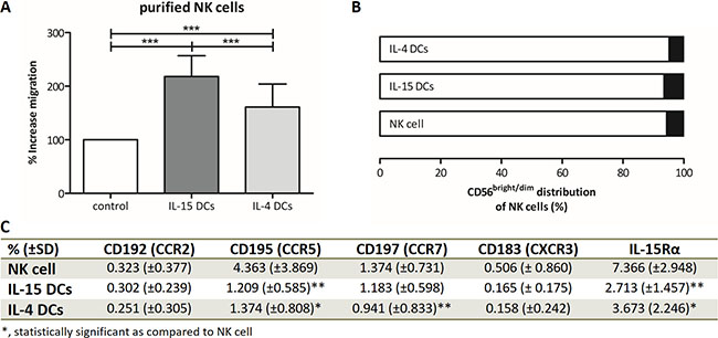 Figure 3: DC-mediated migration and phenotype analysis of purified NK cells. (A) Migration capacity of purified NK cells towards the chemokine milieu of IL-15 DCs and IL-4 DCs is depicted as % increase migration (+ SD) as compared to the negative control (n = 11). (B) Bar graphs represent the relative distribution of Live/dead- CD3- CD56bright and Live/dead- CD3− CD56dim subsets in isolated NK cells prior to migration (NK cell) and in NK cells migrated towards IL-15 DC (IL-15 DCs) and IL-4 DC (IL-4 DCs) wash-out supernatant. (C) Percentage surface expression of chemokine receptors CCR2, CCR5, CCR7 and CXCR3, and IL-15Rα on isolated Live/dead− CD3− CD56+ NK cells before and after migration (n = 8). Repeated measures ANOVA with Bonferroni’s Multiple Comparison Test (NK cell migration, IL-15Rα expression), Friedmann Test with Dunn’s Multiple Comparison Test (CD56 distribution, chemokine receptor expression). ***p < 0.001, **p < 0.01, *p < 0.05.