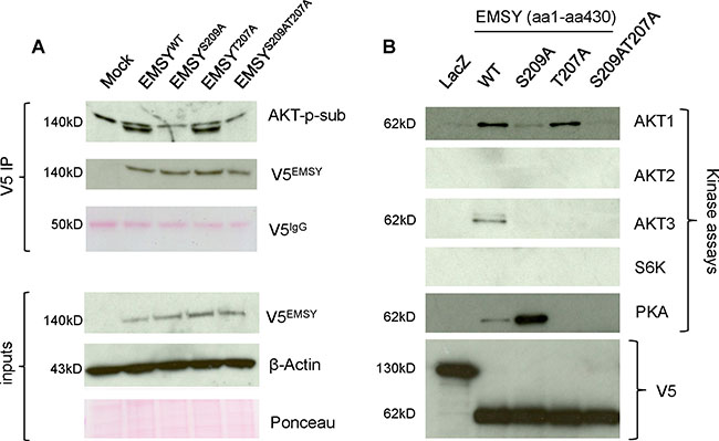 Figure 3: The EMSY T207 phospho-site is phosphorylated by PKA. (A) EMSY-S209, but not EMSY-T207 is a target of AKT phosphorylation. OVCAR8 EMSY-overexpressing cell lysates were immunoprecipitated with V5 antibody and blotted with AKT-phosphosubstrate (AKT-p-sub) to detect AKT-targeted phosphorylation (upper bands are non-specific). The three upper and lower panels represent V5 immunoprecipitation (V5 IP) and starting material (inputs), respectively. Overexpressed EMSY, wild type and mutants, are detected with the V5 antibody (V5EMSY). The IgG heavy chain (V5IgG) ponceau staining served as a V5 immunoprecipitation loading control. Anti-β-Actin and ponceau are loading controls for input materials. (B) Western blot showing in vitro kinase assays using truncated V5-tagged N-terminal EMSY (aa1-aa430) expressed in E. Coli. EMSY wild type and mutants were reacted with the kinases shown. The AKT1, AKT2, AKT3, and S6K kinase reactions were probed with the AKT-phosphosubstrate antibody. The PKA kinase reaction was probed with the PKA-phosphosubstrate antibody. LacZ-expressing vector was used as a negative control. Equal amounts of LacZ and EMSY wild type and mutants are detected with the V5 antibody.