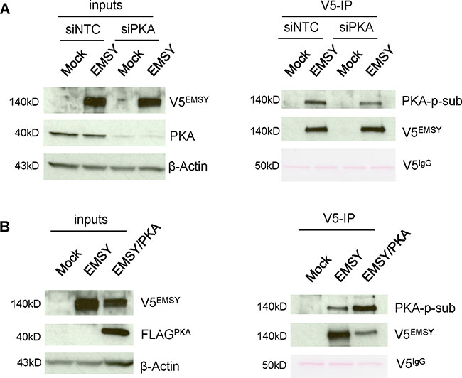Figure 4: PKA expression levels affect EMSY phosphorylation in 293T cells. (A) EMSY-overexpressed and/or PKA-depleted 293T cell lysates were immunoprecipitated with V5 antibody and blotted with PKA-phosphosubstrate (PKA-p-sub) antibody. The left side panels demonstrate EMSY overexpression and PKA knockdown by siRNA. The right panels show V5-immunoprecipitation (V5-IP) and detection of PKA-targeted EMSY phosphorylation using the PKA-p-sub antibody. Overexpressed EMSY is detected with the V5 antibody (V5EMSY). (B) EMSY and PKA co-expressed 293T cell lysates were immunoprecipitated with V5 antibody and blotted with PKA-p-sub. The left panels show EMSY and FLAG-tagged PKA overexpression. The right panels show V5-immunoprecipitation (V5-IP) and detection of PKA-targeted EMSY phosphorylation using the PKA-p-sub antibody. Overexpressed PKA is detected with FLAG (FLAGPKA) antibody. For (A) and (B) IgG heavy chain (V5IgG) ponceau staining and anti-β-Actin served as loading controls.