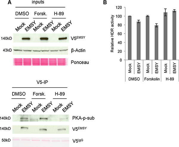 Figure 5: PKA activity is proportional to phosphorylation of EMSY and HDR activity in EMSY-overexpressing cells. (A) EMSY-overexpressed 293T cells were treated with DMSO, the PKA activator forskolin, or the PKA inhibitor H-89. The left panels show the input lysates. The right panels show V5-immunoprecipitaions (V5-IP) and detection of EMSY phosphorylation with the PKA-phosphosubstrate (PKA-p-sub) antibody. Overexpressed EMSY is detected with the V5 (V5EMSY) antibody. Ponceau staining and anti-β-Actin served as loading controls. (B) DR-GFP assay measuring HDR activity in OVCAR8DR-GFP overexpressing wild type EMSY. The cells are treated with DMSO, forskolin, or H-89. HDR activity was measured 24 h post-transfection and post-treatment. All data are normalized to DMSO-treated mock control (vector only) cells.
