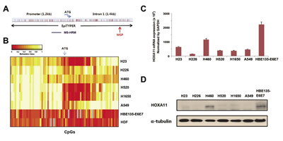 Figure 1: Analysis of the methylation and expression of HOXA11 in vitro. (A) Gene map shows location of CpGs that were studied by different methods in this study. (B) The methylation status of 90 CpGs at the promoter region of HOXA11 was analyzed using the EpiTYPERTM assay in six lung cancer cell lines (H23, H226, H460, H520, H1650, and A549), a bronchial epithelial cell line (HBE135-E6E7), and in a normal human dermal fibroblast (HDF). Two-way cluster analysis shows the methylation status of HOXA11 in eight cell lines. Levels of methylation are depicted in color change on a continuous scale from red (0% methylated) to light yellow (100% methylated). X-axis and Y-axis indicate CpG sites and cell lines, respectively. (C & D) The mRNA levels of HOXA11 were analyzed by real-time PCR (C), and protein levels were determined using western blotting (D). Error bars indicate one standard deviation.