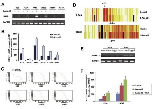 Figure 2: Effects of 5-Aza-dC and/or TSA on demethylation and re-expression of silenced HOXA11. (A & B) Re-expression of silenced HOXA11 was examined by RT-PCR (A) and real-time PCR (B) in six lung cancer cell lines after treatment of the cells with 5-Aza-dC for 72 h. Compared to other cell lines, re-expression of HOXA11 is minimal in H226 and A549 cells. Plus and minus signs indicate the presence or absence of 5-Aza-dC treatment, respectively. (C) Demethylation of silenced HOXA11 was analyzed using MS-HRM assay after treatment of 5-Aza-dC for 72 h in 6 lung cancer cell lines. Red and blue lines indicate the statuses with and without treatment of 5-Aza-dC, respectively. (D) Heatmaps show typical patterns of demethylation: the degree of demethylation is high in H460 cells with less densely methylated HOXA11 and minimal in A549 cells with densely methylated HOXA11. (E & F) H226 and A549 cells that showed minimal re-expression of HOXA11 were treated with 10 M 5-Aza-dC in combination with 0.5 M TSA for 72 h. TSA induced additional re-expression of HOXA11 by RT-PCR (E) and real-time PCR (F). Error bars indicate one standard deviation.
