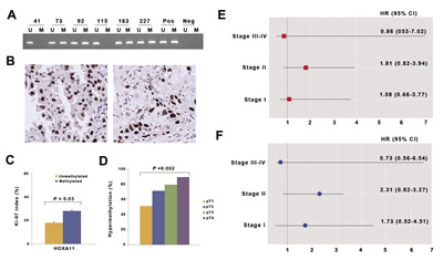 Logistic regression analysis of the data was performed to control for the potential confounding effects of variables such as age, sex, and histology. HOXA11 hypermethylation occurred at a 1.85 times (95% confidence interval [CI] = 1.04-3.29; P = 0.04) higher prevalence in pT2 stage than in pT1 stage, after adjusting for age and histology. Patients with pT3 stage were 5.47 times (95% CI = 1.18-25.50; P = 0.01) more likely to show HOXA11 hypermethylation than those with pT1 stage. Finally, the relationships between hypermethylation of HOXA11 and patient’s overall survival and recurrence-free survival were analyzed across pathologic stage. However, no association was found between HOXA11 hypermethylation and patient’s survival (Figs. 4E and 4F).