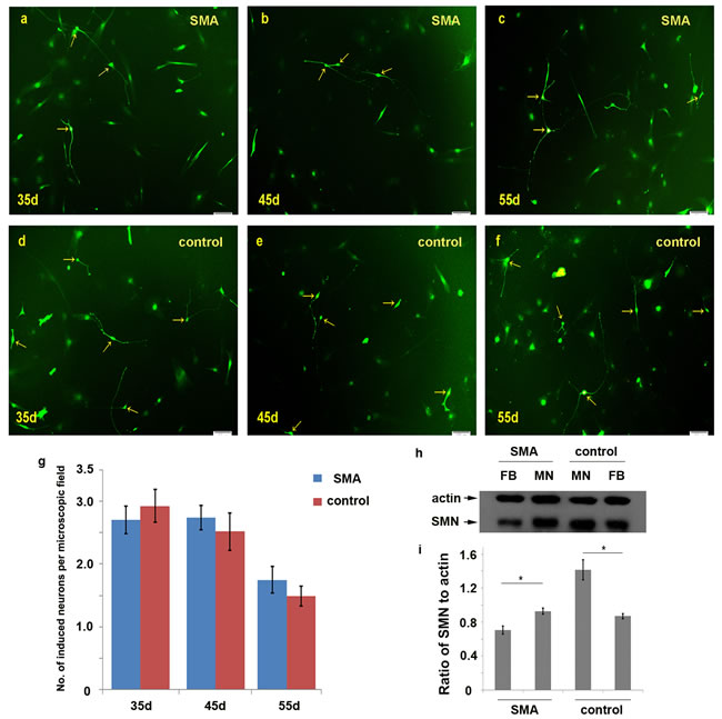 Figure 3: Comparison of the numbers of induced motor neurons in 10× microscopic fields between the SMA and control group. a.-f. The induced neurons observed per microscopic field on days 35, 45 and 55 in the SMA and control groups. g. The average numbers of induced neurons in the SMA and control groups. The data are expressed as the means ± the SEMs. The arrow indicates an induced neuron. h.-i. The SMN protein levels were significantly increased in motor neurons compared with fibroblasts detected by Western blot on day 50. SMN protein levels to actin were expressed as the mean±SEM: SMA-FB, 0.71±0.05; SMA-MN, 0.93±0.03; control-MN: 1.41±0.12; control-FB: 0.87±0.03. FB: fibroblast. MN: motor neuron. * P < 0.05. Scale bars, 100 µm.