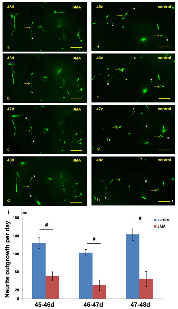 Figure 4: Comparison of the neurite lengths between the SMA and control group from day 45 to 48. a.-h. The neurite outgrowths of the SMA and control neurons were dynamically observed under a fluorescence microscope. i. Statistical analysis of the neurite growth rates of the SMA and control groups. The data are expressed as the means ± the SEMs. The arrow indicates an induced neuron. * indicates the terminal of a neurite. # P < 0.05. Scale bars, 100 µm.