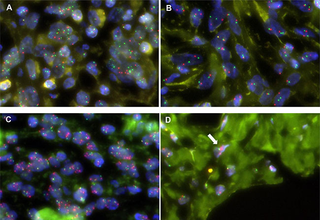 Figure 3: Intratumoral heterogeneity of RTK gene amplification in FISH. Multiple FGFR3 signals (green) are observed in the majority of cells in a certain area (A) but not in any cells in another area (B) of the DD component of DDLPS_08T. Multiple ERBB3 signals (red) are observed in the majority of cells in the DD component (A) and only a few cells in the WD component (B) of DDLPS_27T.