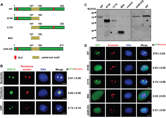 Figure 1: Subcellular localization of RRP15. A. The schematic diagrams of RRP15 wild type (WT) and different mutants. B. Immunofluorescence analysis of HeLa cells with rabbit α-RRP15 and mouse α-nucleolin, α-fibrillarin or α-UBF. DNA was visualized by DAPI staining. R values were obtained as described (see supplemental Materials and Methods). Scale bars, 5 μm. C. HeLa cells were transfected with plasmids of pEGFP-RRP15WT, pEGFP-RRP15N150, pEGFP-RRP15C175, pEGFP-RRP15M43 or pEGFP- RRP15Δ228-232 for 48 h. Cell lysates were immunoblotted with mouse α-GFP. D. HeLa cells grown on coverslips were transfected with plasmids of pEGFP-RRP15WT, pEGFP-RRP15N150, pEGFP-RRP15C175, pEGFP-RRP15M43 or pEGFP- RRP15Δ228-232 for 48 h. The cells were fixed and stained with mouse α-nucleolin and DAPI. Scale bars, 5 μm. R values were obtained as described in (B).