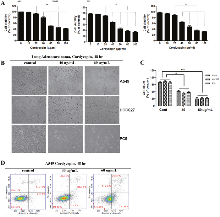 Figure 1: Cordycepin induces apoptosis in lung cancer cells. A. Inhibition of the growth of lung cancer cells by cordycepin. A549 cancer cells were exposed to cordycepin at 0, 20, 40, 60, 80, or 100 μg/mL for 48 h. Data are presented as the mean ± standard deviation from triplicate experiments. *p < 0.05 and **p < 0.01 vs. untreated control. B. Micrographs of A549 cells treated with 40 or 60 μg/mL of cordycepin for 48 h. Magnification 400×. C. Cell counts (% of control) after treatment with cordycepin at 0, 40, or 60 μg/mL for 48 h. D. Apoptosis analysis of A549 cells exposed to cordycepin.